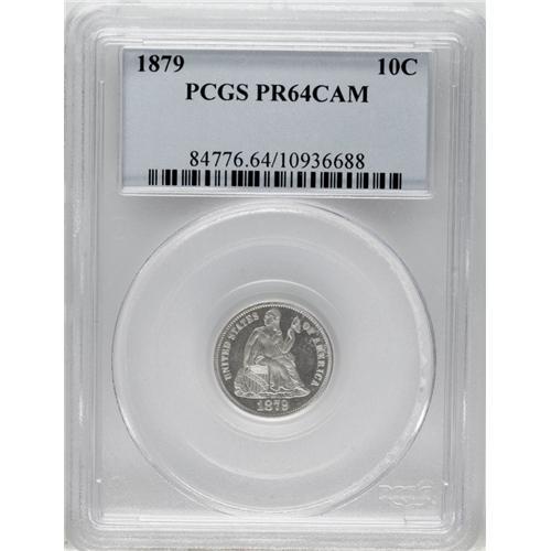 <B>1879 10C PR64 Cameo PCGS.</B></I> An attractive Choice Cameo proof that has strongly frosted devices and light haze in the fields. If not for a significant hairline in the right obverse field, this specimen could have achieved a higher grade.<BR><BR><b>Shipping:</b> Coins & Currency (<a target="_blank" href="http://www.heritageauctions.com/common/shipping.php">view shipping information</a>)