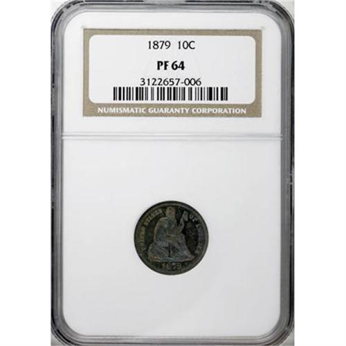 <B>1879 10C PR64 NGC.</B></I> This delightful proof has fully mirrored fields and excellent contrast, although deep blue, gold, and iridescent toning prevents a cameo designation. <BR><BR><B>Coin Engraver:</B> Christian Gobrecht<BR><BR><b>Shipping:</b> Coins & Currency (<a target="_blank" href="http://www.heritageauctions.com/common/shipping.php">view shipping information</a>)