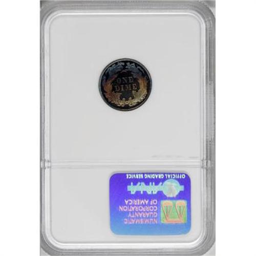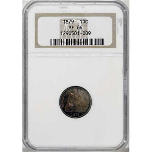 <B>1879 10C PR66 NGC.</B></I> A delight for the toning enthusiast, this type Premium Gem offers rich gold-orange, green, and blue on the obverse with horizontal bands of aqua, powder-blue, rose, reddish-orange, and lemon-gold on the reverse. Carefully preserved and eminently appealing. Census: 22 in 66, 11 finer (10/07).<BR><BR><B>Coin Engraver:</B> Christian Gobrecht<BR><BR><b>Shipping:</b> Coins & Currency (<a target="_blank" href="http://www.heritageauctions.com/common/shipping.php">view shipping information</a>)