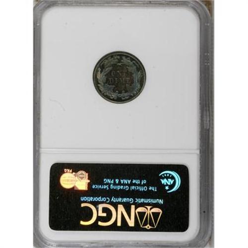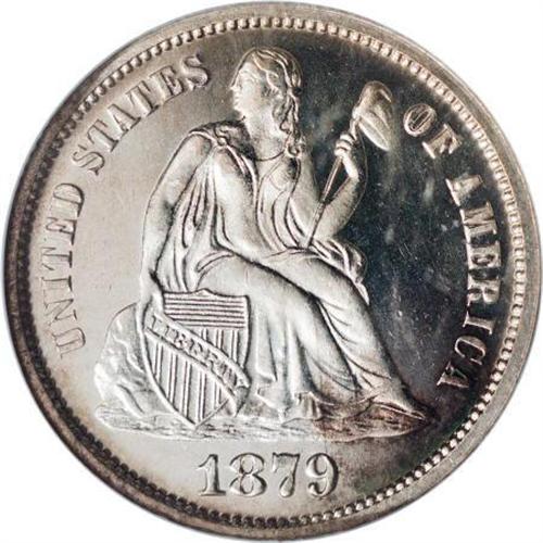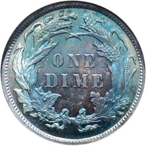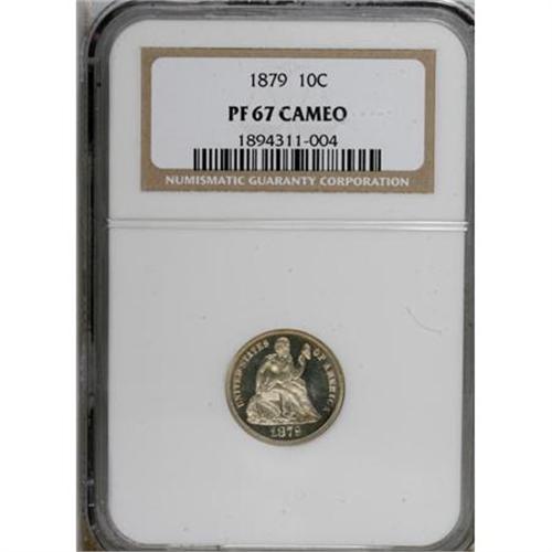 <B>1879 10C PR67 Cameo NGC.</B></I> The seated Liberty is thickly frosted, and provides prominent contrast with the mirrored obverse field. A splash of navy-blue toning dominates the central reverse, while the obverse is untoned save for a blush of sea-green along the lower right margin. A low mintage date. Census: 12 in 67 Cameo, 0 finer (9/07).<BR><BR><b>Shipping:</b> Coins & Currency (<a target="_blank" href="http://www.heritageauctions.com/common/shipping.php">view shipping information</a>)