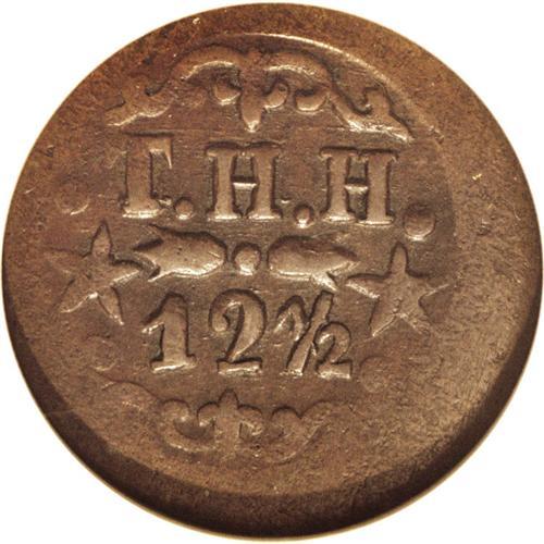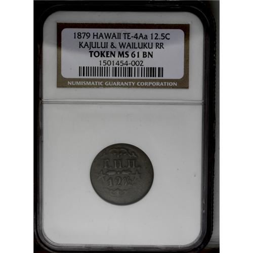 <B>1879<12.5C> T. Hobron 12 1/2 Cents Token MS61 Brown NGC.</B></I> M. 2TE-8. Incorrectly designated as TE-4Aa by NGC. Captain Thomas H. Hobron struck these tokens for use at his Kahulaui general store and on his Wailuluku railroad line. This generally smooth chocolate-brown piece has boldly impressed centers, while the peripheral elements are softly defined, as usual for this token issue. Listed on page 376 in the 2007 <I>Guide Book.</B></I>
