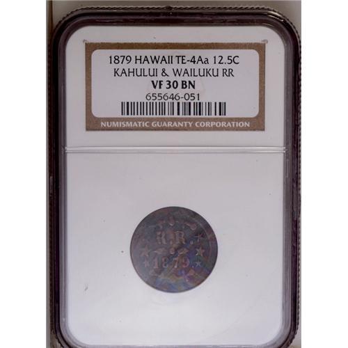 <B>1879<12.5C> T. Hobron 12 1/2 Cents Token VF30 NGC.</B></I> M. 2TE-8. Incorrectly designated as TE-4Aa by NGC. An evenly struck representative of this popular Hawaiian railroad and merchant issue, issued by entrepreneur Thomas Hobron. The slightly wavy and granular surfaces display golden-brown and sea-green toning. Listed on page 376 in the 2007 <I>Guide Book.</B></I>