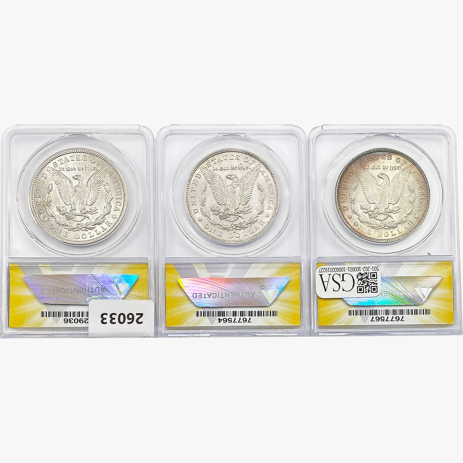 e. Coins sold referencing a third-party grading service are sold "AS IS" without any express or implied warranty, except for a guarantee by GSA that they are genuine. Removal or alteration of the holder, voids all of Bidder's claims concerning that Product. Certain warranties may be available from the grading services and Bidders are referred to them for further details: Numismatic Guaranty Corporation (NGC), PO Box 4776, Sarasota, FL 34230, www.ngccoin.com/services/writtenguarantee.asp; Professional Coin Grading Services (PCGS), PO Box 9458, Newport Beach, CA 92658, www.pcgs.com/guarantee.html; ANACS, 6555 S. Kenton St., Ste. 303, Englewood, CO 80111; and Independent Coin Grading Co. (ICG), 7901 East Bellview, Ave., Suite 50, Englewood, CO 80111.