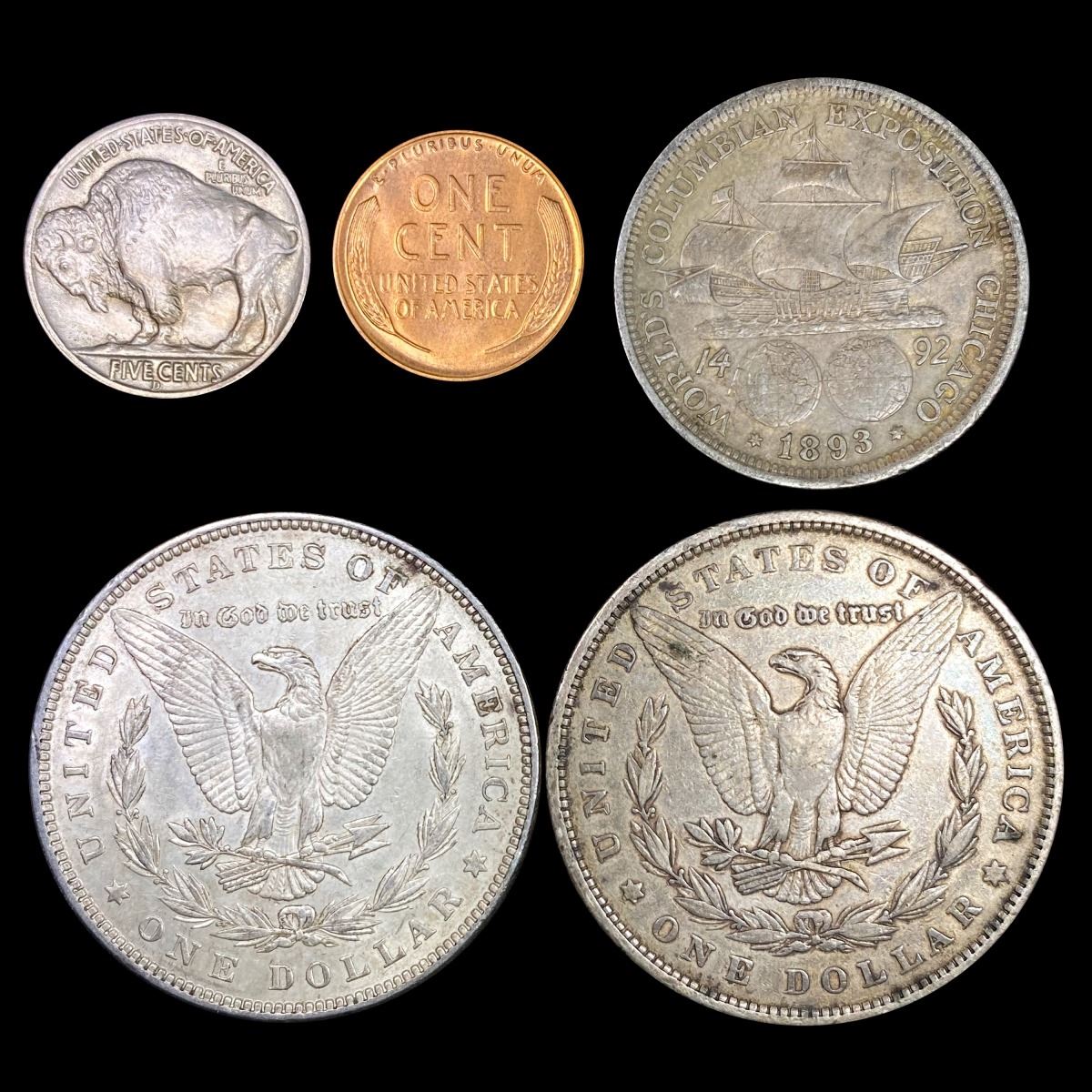 1879-1938 5c Buffalo, $1 Morgan, 1C Wheat, 50C