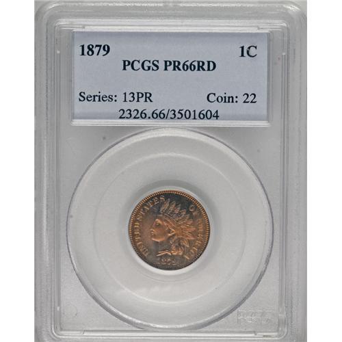<B>1879 1C PR66 Red PCGS.</B></I> A magnificent champagne-tan Premium Gem, virtually devoid of carbon or contact. Although 3,200 proofs were struck, only a small percentage of survivors retain their original mint red color. Population: 25 in 66 Red, 10 finer (2/07).<BR><BR><b>Shipping:</b> Coins & Currency (<a target="_blank" href="http://www.heritageauctions.com/common/shipping.php">view shipping information</a>)