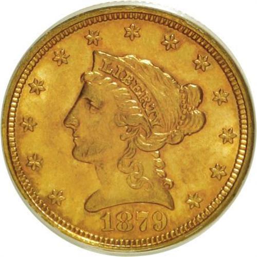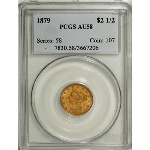 <B>1879 $2 1/2 AU58 PCGS.</B></I> PCGS Population (102/317). NGC Census: (102/490). Mintage: 88,990. Numismedia Wsl. Price for NGC/PCGS coin in AU58: $242. (#7830)<BR><BR><B>Coin Engraver:</B> Christian Gobrecht<BR><BR><b>Shipping:</b> Coins & Currency (<a target="_blank" href="http://www.heritageauctions.com/common/shipping.php">view shipping information</a>)