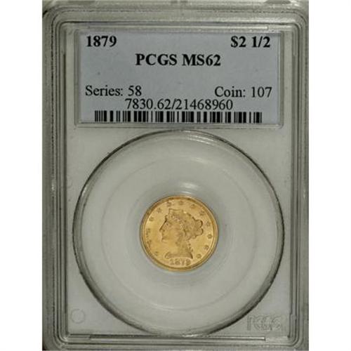 <B>1879 $2 1/2 MS62 PCGS.</B></I> PCGS Population (111/135). NGC Census: (193/124). Mintage: 88,990. Numismedia Wsl. Price for NGC/PCGS coin in MS62: $485. (#7830)<BR><BR><B>Coin Engraver:</B> Christian Gobrecht<BR><BR><b>Shipping:</b> Coins & Currency (<a target="_blank" href="http://www.heritageauctions.com/common/shipping.php">view shipping information</a>)