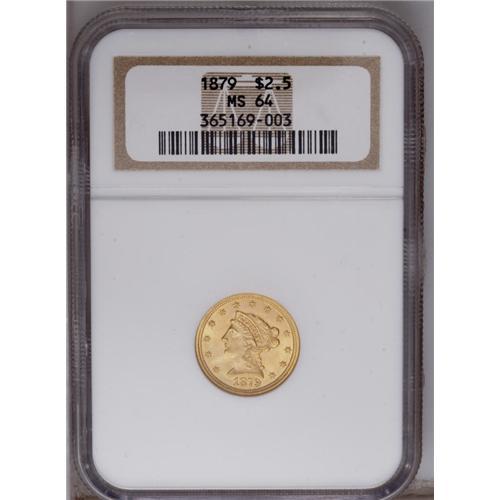 <B>1879 $2 1/2 MS64 NGC.</B></I> Frosty and bright with pleasing light coloration and a few nicks in the fields that define the grade. Still a very attractive near-Gem, from a scarcer issue not often encountered in grades exceeding MS62. Census: 35 in 64, 12 finer (1/06).