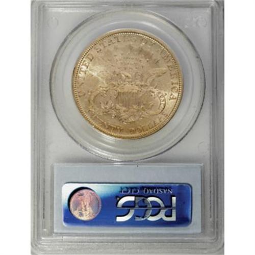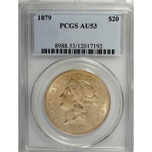 <B>1879 $20 AU53 PCGS.</B></I> A fully detailed, highly lustrous, and very flashy example. Heavy abrasions cover each side.<BR><I>From The York/Hallenbeck #2 Current Finest PCGS Registry Set of Liberty Double Eagles.</B></I><BR><BR><B>Coin Engraver:</B> James B. Longacre<BR><BR><b>Shipping:</b> Coins & Currency (<a target="_blank" href="http://www.heritageauctions.com/common/shipping.php">view shipping information</a>)