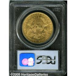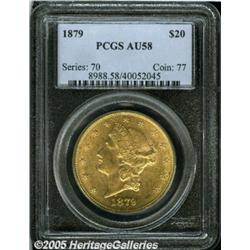 <B>1879 $20 AU58 PCGS.</B></I> Displaying virtually full luster, this piece is held back from a Mint State rating by circulation marks mostly on the obverse.