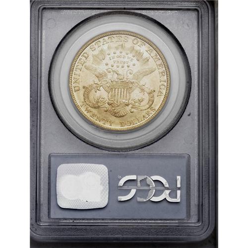 <B>1879<$20> AU58 PCGS.</B></I> A lustrous near-Mint example, free of noticeable highpoint wear, with light green-gold and red-orange coloration and moderate marks on both obverse and reverse.<BR><I>From The Steve Glenn Collection.</B></I> <BR><BR><B>Important notice:</B> Heritage usually auctions material at the rate of 200-250 lots per hour. On some occasions eBay Live bid software or the Internet may not be able to keep up with the pace of the auction. We recommend placing a realistic absentee bid now as insurance to avoid disappointment. Occasionally the auctioneer may eliminate or reject an eBay Live bid, and the auctioneer may also reopen a lot after the close of the eBay live bidding (usually because we missed an audience bid), and may reject your bid even if it shows you as the winning bidder. By bidding via eBay Live, you agree that Heritage may award the lot to another bidder at its sole discretion under the circumstances described above or any other reasonable circumstances. Since eBay bids are not shown to us until we open the lot on the floor, we treat those bids just like floor bids. In most cases the floor responds before the eBay bid is presented to us, due to Internet lag time, so for consistency we have made it a policy that floor bids are always considered first over tie eBay live bids. Also please note that all Heritage lots purchased through eBay Live carry a 20% Buyer's Premium. Please make sure you read the Terms and Conditions before you bid. This lot is being auctioned in conjunction with a live floor auction by Heritage Galleries & Auctioneers. All final auction and invoice information will be supplied by Heritage Galleries & Auctioneers, and all other information should be considered preliminary. Lot:4280 <BR><BR><B>Winning Notification and Billing:</B> After the FINAL session in this auction is complete, Heritage will send e-mail and snail mail invoices. This process normally takes several days. All final auction and invoice information will be supplied by Heritage Galleries & Auctioneers, and all other information should be considered preliminary. <BR><BR>This auction will be conducted on a live auction floor and over the Internet through eBay Live. If you choose to place an absentee bid, please take a moment to <font color='#0000ff'><u><a href='http://pages.ebay.com/liveauctions/help/before/laabsentee.html'>learn how eBay Live absentee bidding works</a></u></font><font color='#000000'>
