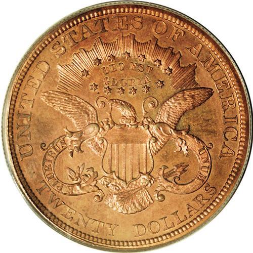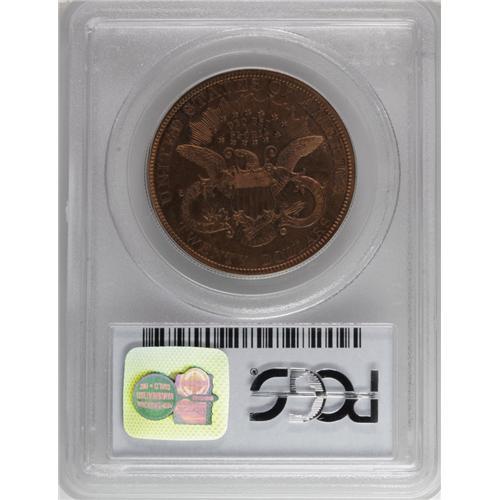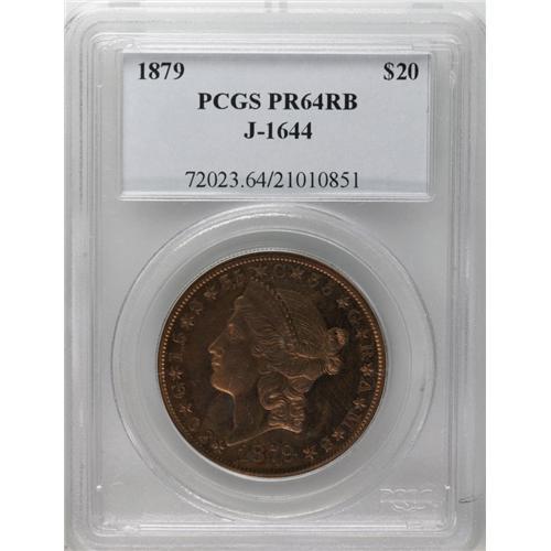 <B>1879 $20 Liberty Head Quintuple Stella, Judd-1644, Pollock-1844, Low R.7, PR64 Red and Brown PCGS.</B></I> This is the same design as the gold quintuple stella, Judd-1643, also offered in this sale. Struck in copper with a reeded edge. Like many other copper pattern issues, about a dozen quintuples are known in copper, with just five pieces known in gold. A few of the copper pieces have been gold plated. Both sides of this important pattern exhibit nearly full orange mint color with slight mellowing to lighter brown. A tiny stain is evident in the field at Liberty's neck, and a small scrape in the left obverse field limits the grade, but otherwise the surfaces are exceptional.<BR><I>From The Jones Beach Collection.</B></I><BR><BR><b>Shipping:</b> Coin/Currency (<a target="_blank" href="http://www.heritageauctions.com/common/shipping.php">view shipping information</a>)