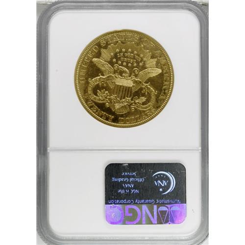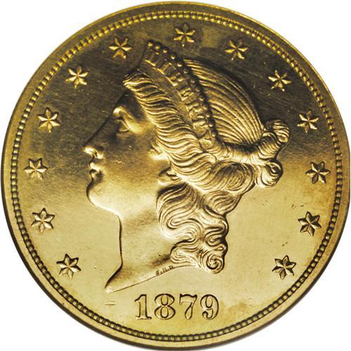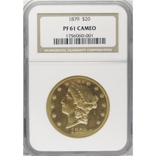 <B>1879 $20 PR61 Cameo NGC.</B></I> As with all proof double eagles of this design type, the 1879 is very rare in the absolute sense. Only 30 pieces were produced, and from that number, the estimated number of survivors is in a narrow range. Akers estimates that only 10 or 11 pieces are extant, while Breen states that only 8-10 pieces have survived. With numbers like those, there are very few coins, and opportunities to buy those coins, that the collector has in the course of a lifetime.<BR> While obviously hairlined, which explains the grade of this coin, there is still a remarkable amount of deep reflectivity in the fields on each side. Likewise, the devices show a noticeable amount of mint frost which gives the coin its cameo contrast. A few irregular patches of golden-brown patina are scattered around the peripheries, but the only contact marks of any importance are one just below the point of the bust and a couple of even smaller ones just above. Census: 1 in 61 Cameo, 4 finer (12/06).<BR><BR><b>Shipping:</b> Coin/Currency (<a target="_blank" href="http://www.heritageauctions.com/common/shipping.php">view shipping information</a>)