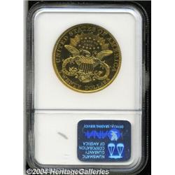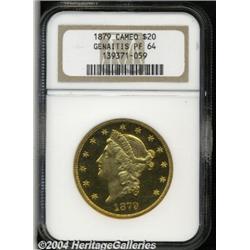 <B>1879<$20> PR64 Cameo NGC.</B></I> As with the other gold denominations struck in this year, only 30 proofs were produced of the 1879 Double Eagle. Of that number, Akers estimates that only 10 or 11 pieces are extant, while Breen states that only 8-10 pieces have survived. This is a spectacular cameo proof that has deeply reflective mirrors in the fields and heavy mint frost on the devices which produces the stark field-to-device contrast seen on each side. Rich orange-gold color covers both obverse and reverse. The only identifying mark we see for future pedigree purposes is a slight discoloration, i.e., a light alloy spot, on the obverse rim at 12 o'clock. Exceptional quality combined with exceptional rarity.<BR><I>Ex: Atlanta ANA Sale (Heritage, 8/2001), lot 8200.</B></I><BR><I>From The Greenwich Collection, Part One.</B></I> <BR><BR><B>Important notice:</B> Heritage usually auctions material at the rate of 200-250 lots per hour. On some occasions eBay Live bid software or the Internet may not be able to keep up with the pace of the auction. We recommend placing a realistic absentee bid now as insurance to avoid disappointment. Occasionally the auctioneer may eliminate or reject an eBay Live bid, and the auctioneer may also reopen a lot after the close of the eBay live bidding (usually because we missed an audience bid), and may reject your bid even if it shows you as the winning bidder. By bidding via eBay Live, you agree that Heritage may award the lot to another bidder at its sole discretion under the circumstances described above or any other reasonable circumstances. Since eBay bids are not shown to us until we open the lot on the floor, we treat those bids just like floor bids. In most cases the floor responds before the eBay bid is presented to us, due to Internet lag time, so for consistency we have made it a policy that floor bids are always considered first over tie eBay live bids. Also please note that all Heritage lots purchased through eBay Live carry a 20% Buyer's Premium. Please make sure you read the Terms and Conditions before you bid.