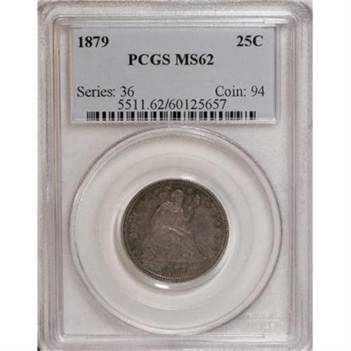 <B>1879 25C MS62 PCGS.</B></I> Uncommonly boldly struck for this low-mintage issue with soft hints of luster beneath rich slate-blue and violet patina. The toning obscures a handful of wispy abrasions that account for the grade.<BR><BR><B>Coin Engraver:</B> Christian Gobrecht<BR><BR><b>Shipping:</b> Coins & Currency (<a target="_blank" href="http://www.heritageauctions.com/common/shipping.php">view shipping information</a>)