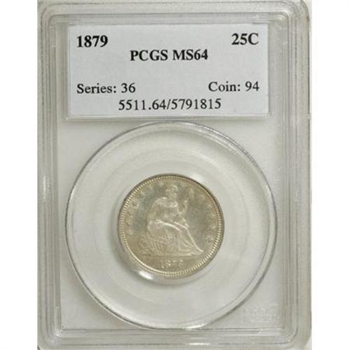 <B>1879 25C MS64 PCGS.</B></I> At first glance, this piece looks just like the many surviving proofs, although closer examination reveals weakness of strike and other characteristics that prevent attribution as a proof. The head and upper obverse stars are mostly flat, while the remaining parts of the obverse and all of the reverse are boldly defined. Traces of gold toning are visible over pearl luster.<BR><BR><b>Shipping:</b> Coins & Currency (<a target="_blank" href="http://www.heritageauctions.com/common/shipping.php">view shipping information</a>)