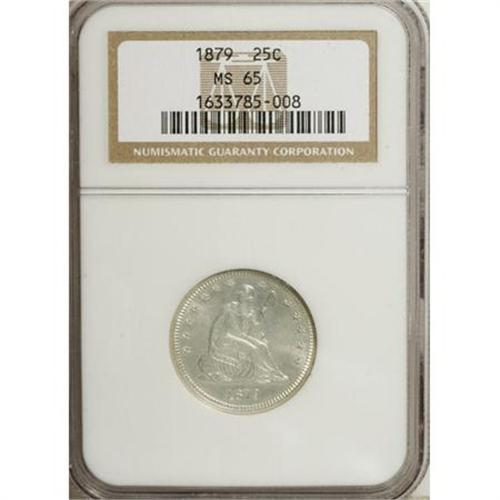 <B>1879 25C MS65 NGC.</B></I> The Seated Liberty has light gold color, while the reverse is fully brilliant. A boldly struck and rather prooflike Gem that has a well preserved reverse. A scarce issue, as only 13,700 pieces were struck.<BR><BR><b>Shipping:</b> Coins & Currency (<a target="_blank" href="http://www.heritageauctions.com/common/shipping.php">view shipping information</a>)