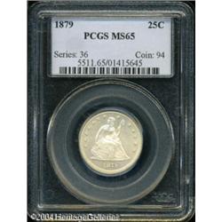 1879 25C MS65 PCGS. Dusky whispers of rose and pal <B>1879 25C MS65 PCGS.</B></I> Dusky whispers of rose and pale-blue colors embrace this silky and meticulously struck Gem. Beautifully preserved, showing just a few minute contact marks in the upper left obverse field. Only 13,600 business strikes were issued. Population: 26 in 65, 47 finer (10/04). <BR><BR><B>Important notice:</B> Heritage usually auctions material at the rate of 200-250 lots per hour. On some occasions eBay Live bid software or the Internet may not be able to keep up with the pace of the auction. We recommend placing a realistic absentee bid now as insurance to avoid disappointment. Occasionally the auctioneer may eliminate or reject an eBay Live bid, and the auctioneer may also reopen a lot after the close of the eBay live bidding (usually because we missed an audience bid), and may reject your bid even if it shows you as the winning bidder. By bidding via eBay Live, you agree that Heritage may award the lot to another bidder at its sole discretion under the circumstances described above or any other reasonable circumstances. Since eBay bids are not shown to us until we open the lot on the floor, we treat those bids just like floor bids. In most cases the floor responds before the eBay bid is presented to us, due to Internet lag time, so for consistency we have made it a policy that floor bids are always considered first over tie eBay live bids. Also please note that all Heritage lots purchased through eBay Live carry a 20% Buyer's Premium. Please make sure you read the Terms and Conditions before you bid. This lot is being auctioned in conjunction with a live floor auction by Heritage Galleries & Auctioneers. All final auction and invoice information will be supplied by Heritage Galleries & Auctioneers, and all other information should be considered preliminary. Lot:5892