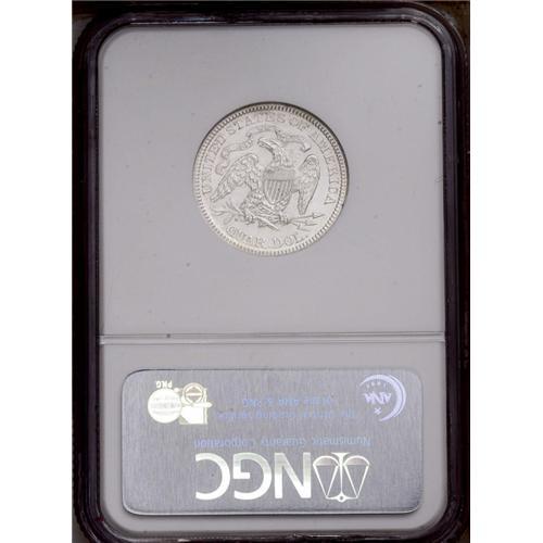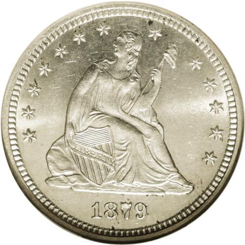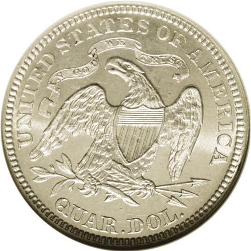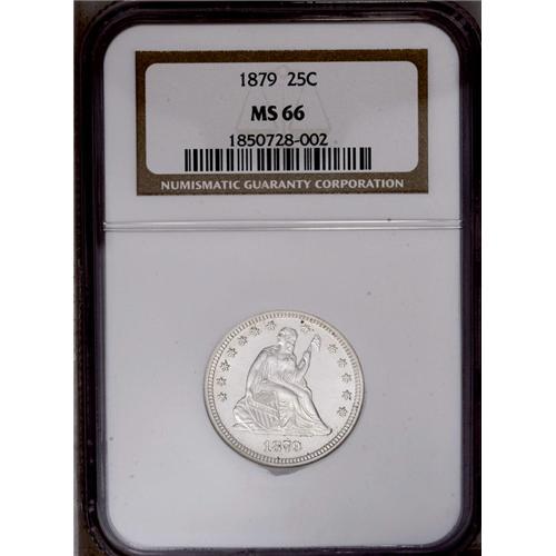 <B>1879<25C> MS66 NGC.</B></I> Type Two Reverse. An impressive Premium Gem that possesses frosty devices and semi-prooflike fields. The strike is penetrating, and neither side exhibits mentionable marks or hairlines. Essentially brilliant, although a few tiny russet flecks are noted near the date and stars. Only 13,600 pieces were struck, since the mints concentrated on silver dollar production.