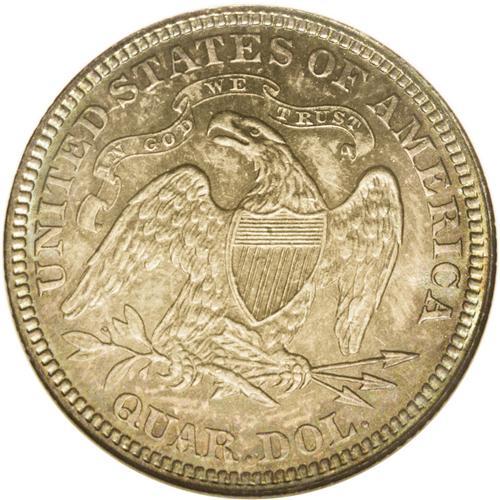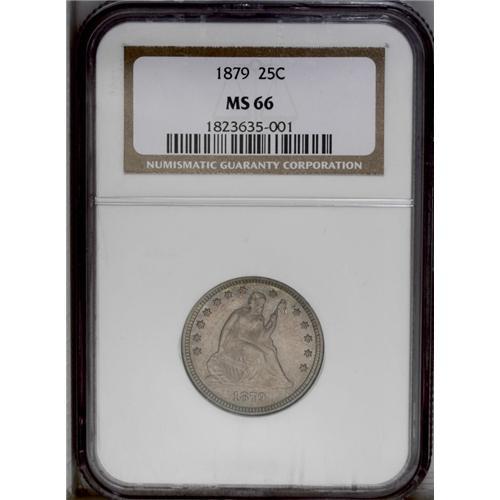 <B>1879<25C> MS66 NGC.</B></I> Type Two Reverse. Rich golden-brown toning dominates, although sea-green graces the margins. Cartwheel luster overcomes the medium to deep patina. Exactingly struck and impressively preserved. A mere 13,600 pieces were struck, because of Mint concentration on silver dollar coinage. Census: 30 in 66, 31 finer (9/06).