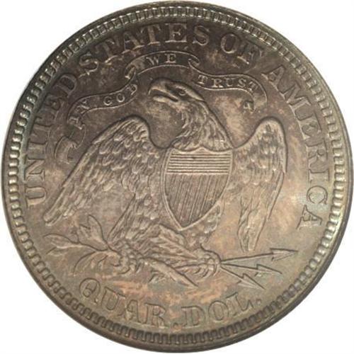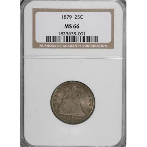 <B>1879 25C MS66 NGC.</B></I> Type Two Reverse. An amazing Gem with frosty luster beneath rich heather and sea-green toning, with additional lilac color on the reverse. The 1879 quarter is a low mintage issue, with a total production of only 13,600 coins, although quite a few better grade pieces exist. Population: 26 in 66, 23 finer (8/07).<I><BR>From The Beau Clerc Collection.</B></I><BR><BR><B>Coin Engraver:</B> Christian Gobrecht<BR><BR><b>Shipping:</b> Coins & Currency (<a target="_blank" href="http://www.heritageauctions.com/common/shipping.php">view shipping information</a>)