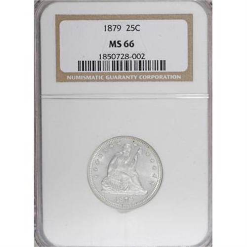 <B>1879 25C MS66 NGC.</B></I> This Premium Gem displays semi-prooflike fields that offset the mildly frosted, well struck design elements. The strike is bold and neither side exhibits offensive marks or hairlines. A faint hint of pink tone is noted on otherwise brilliant and untoned surfaces. Census: 31 in 66, 32 finer (12/07).<BR><BR><B>Coin Engraver:</B> Christian Gobrecht<BR><BR><b>Shipping:</b> Coins & Currency (<a target="_blank" href="http://www.heritageauctions.com/common/shipping.php">view shipping information</a>)