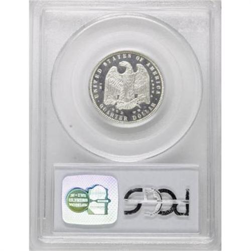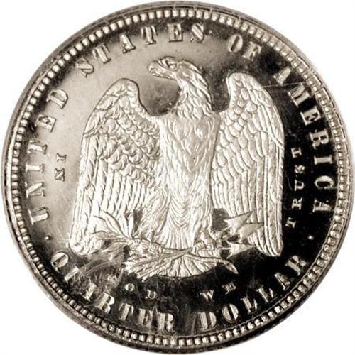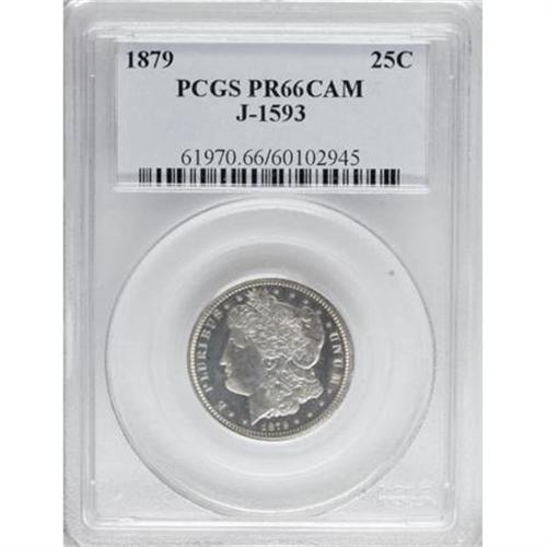 <B>1879 25C Morgan Quarter Dollar, Judd-1593, Pollock-1787, Low R.7, PR66 Cameo PCGS.</B></I> The Morgan design as adopted for the head of the dollar of 1878, but adapted to the smaller format of the quarter. The reverse features an erect eagle with raised wings. Struck in silver with a reeded edge. This design was also struck in copper. Only 12-15 pieces are believed known of the silver strikings. Such pieces have significant cross-over interest to Morgan dollar collectors. This is a magnificent cameoed example that has thickly frosted devices set against deeply reflective, mirrored fields. Just a hint of light russet toning is seen around the periphery of the obverse.<BR><BR><b>Shipping:</b> Coins & Currency (<a target="_blank" href="http://www.heritageauctions.com/common/shipping.php">view shipping information</a>)