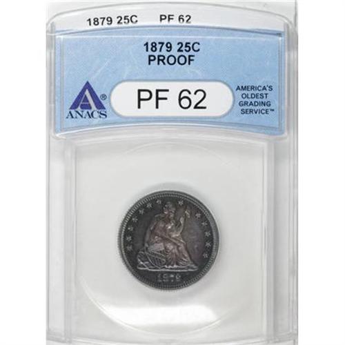 <B>1879 25C PR62 ANACS.</B></I> NGC Census: (20/204). PCGS Population (48/179). Mintage: 1,100. Numismedia Wsl. Price for NGC/PCGS coin in PR62: $375. (#5580)<BR><BR><B>Coin Engraver:</B> Christian Gobrecht<BR><BR><b>Shipping:</b> Coins & Currency (<a target="_blank" href="http://www.heritageauctions.com/common/shipping.php">view shipping information</a>)