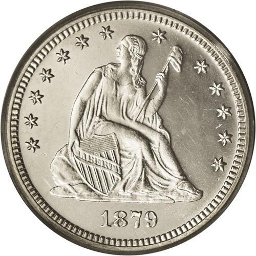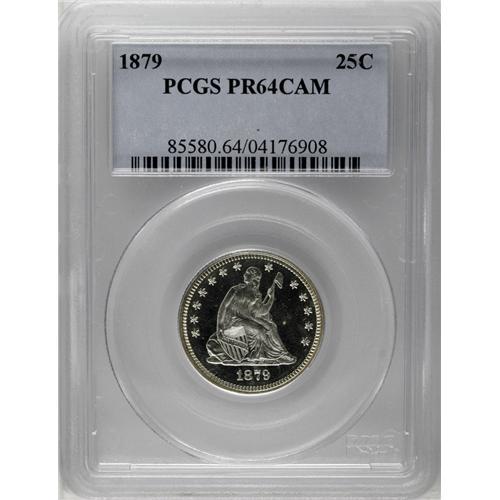 <B>1879<25C> PR64 Cameo PCGS.</B></I> Type Two Reverse. Ice-white devices demonstrate favorable contrast with the glittering fields. Brilliant except for a tiny spot on the right obverse field. A low mintage date with a combined commercial and proof production of 14,700 pieces. Population: 7 in 64 Cameo, 11 finer (6/06).<BR><I>From The Mulholland Collection.</B></I>