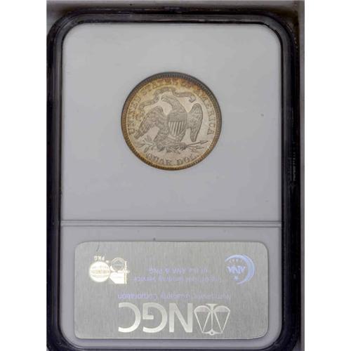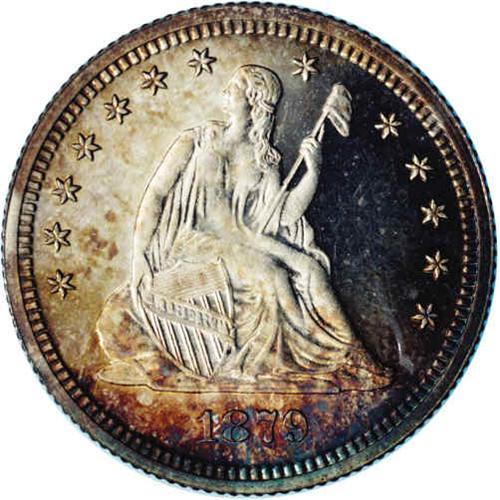 <B>1879<25C> PR65 Cameo NGC.</B></I> Breen-4105, Briggs 2-B. Type II Reverse. Official Mint Records state that only 250 Proofs were coined, but as Breen noted: "The low mintage has not been taken seriously." Today, the <I>Guide Book</B></I> shows a mintage of 1,100 Proofs, in line with the production of other silver denominations, and probably closer to the real production total. Today, some prooflike business strikes have been certified as Proof and vice-versa. This is a lovely Cameo Proof with exceptional contrast. The devices are frosty and lustrous with white color. The fields are deeply mirrored and the whole is accented by peripheral rose, lilac, and blue color, mostly on the obverse. Population: 7 in 65, 11 finer (8/05).