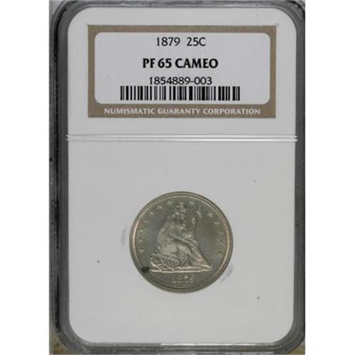 <B>1879 25C PR65 Cameo NGC.</B></I> Type Two Reverse. This is a brilliant proof striking with good cameo contrast, save for a small gray toning spot at 8 o'clock on the obverse rim. A frosty Gem, although tiny field chatter marks appear under a loupe. Nice nonetheless. Census: 8 in 65 Cameo, 13 finer (3/08).<BR><BR><b>Shipping:</b> Coins & Currency (<a target="_blank" href="http://www.heritageauctions.com/common/shipping.php">view shipping information</a>)