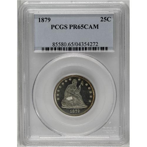 <B>1879<25C> PR65 Cameo PCGS.</B></I> Type Two Reverse. A resplendent Gem quality quarter with deeply mirrored fields and excellent eye appeal. The devices are frosty and lustrous. Each side has a thin crescent of gold and iridescent toning along the right side. Population: 4 in 65 Cameo, 6 finer (2/06).