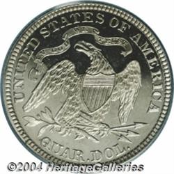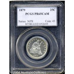 <B>1879<25C> PR65 Cameo PCGS.</B></I> There is little or no toning on either side of this bright, no-questions Gem. Both sides are razor sharp in detail with appreciable field-to-device contrast. A distraction-free specimen striking of this, the first of the low mintage Seated Liberty Quarters from the late 1870s and 1880s. Conditionally scarce. Population: 2 in 65, 5 finer (3/04).<BR><I>From the JFS Collection.</B></I> <BR><BR><B>Important notice:</B> Heritage usually auctions material at the rate of 200-250 lots per hour. On some occasions eBay Live bid software or the Internet may not be able to keep up with the pace of the auction. We recommend placing a realistic absentee bid now as insurance to avoid disappointment. Occasionally the auctioneer may eliminate or reject an eBay Live bid, and the auctioneer may also reopen a lot after the close of the eBay live bidding (usually because we missed an audience bid), and may reject your bid even if it shows you as the winning bidder. By bidding via eBay Live, you agree that Heritage may award the lot to another bidder at its sole discretion under the circumstances described above or any other reasonable circumstances. Since eBay bids are not shown to us until we open the lot on the floor, we treat those bids just like floor bids. In most cases the floor responds before the eBay bid is presented to us, due to Internet lag time, so for consistency we have made it a policy that floor bids are always considered first over tie eBay live bids. Also please note that all Heritage lots purchased through eBay Live carry a 20% Buyer's Premium. Please make sure you read the Terms and Conditions before you bid. </span></font></tr></table></td></tr></table>
