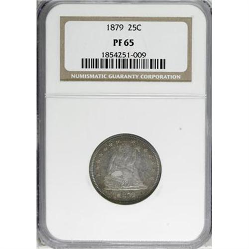 <B>1879 25C PR65 NGC.</B></I> NGC Census: (42/28). PCGS Population (25/15). Mintage: 1,100. Numismedia Wsl. Price for NGC/PCGS coin in PR65: $1,675. (#5580)<BR><BR><B>Coin Engraver:</B> Christian Gobrecht<BR><BR><b>Shipping:</b> Coins & Currency (<a target="_blank" href="http://www.heritageauctions.com/common/shipping.php">view shipping information</a>\)
