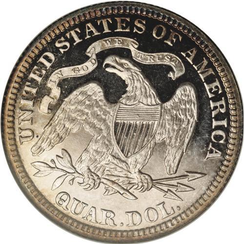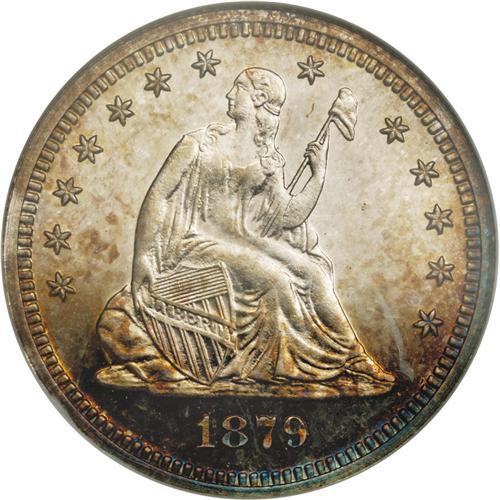 <B>1879<25C> PR66 Cameo NGC.</B></I> Type Two Reverse. A remarkable Premium Gem with exceptional cameo contrast, and nearly qualifying as an Ultra Cameo proof. Deeply mirrored fields and highly lustrous devices are present on both sides, although the obverse die was lapped before this coin was struck, and pools of die polish appear within the details of the obverse device. The obverse has bright gold toning over about half the surface, and the reverse has similar toning only around the border. Census: 8 in 66, 4 finer (4/06).