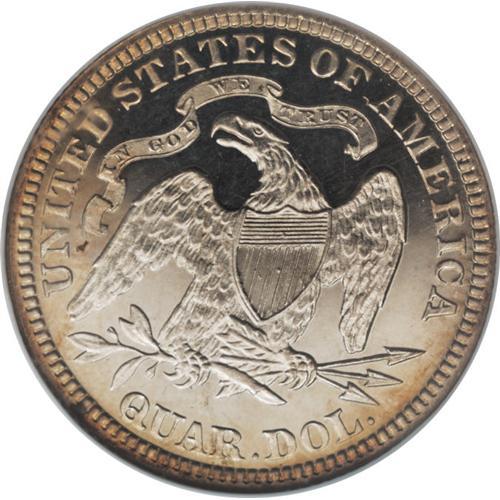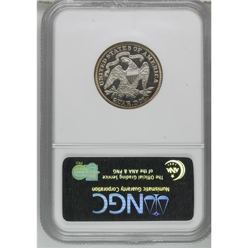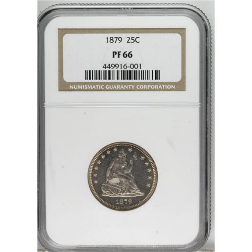 <B>1879 25C PR66 NGC.</B></I> Type Two Reverse. Although the proof mintage for this year is uncertain, it is known that only 13,600 business strikes were produced, the start of an 11-year run of low-mintage P-mint Seated quarters. This enticing proof has a blush of lilac-gold on each side, with an area of brilliance remaining in the center reverse and considerable contrast there as well, although the lesser contrast on the obverse precludes a Cameo designation. A couple of interesting die dots are noted in the horizontal and vertical shield stripes. Census: 18 in 66, 10 finer (4/07).<BR><BR><b>Shipping:</b> Coins & Currency (<a target="_blank" href="http://www.heritageauctions.com/common/shipping.php">view shipping information</a>)