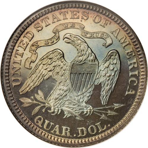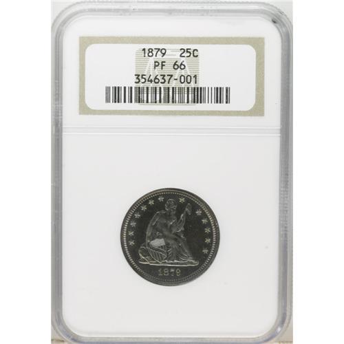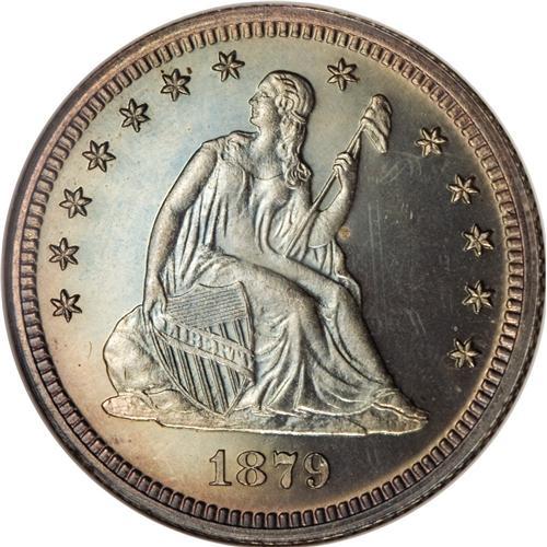 <B>1879 25C PR66 NGC.</B></I> Type Two Reverse. Fully struck on all of the design elements, with watery reflectivity in the fields and beautifully deep steel-green and coral toning on both sides. Traces of die rust are noted on Liberty's head and breast. This Premium Gem is carefully preserved and free of distractions. From a proof mintage of 250 pieces.<BR><BR><b>Shipping:</b> Coins & Currency (<a target="_blank" href="http://www.heritageauctions.com/common/shipping.php">view shipping information</a>)
