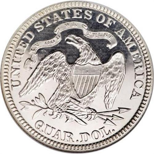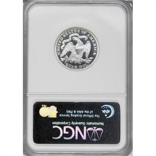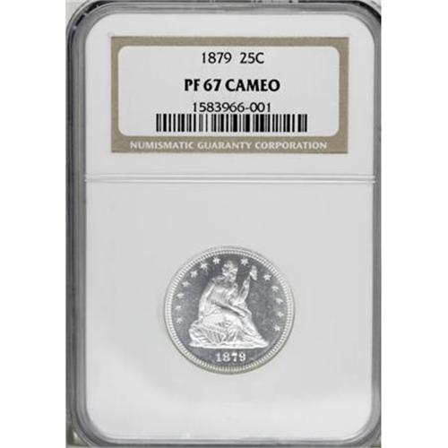 <B>1879 25C PR67 Cameo NGC.</B></I> Type Two Reverse. This Superb Gem proof is tied for the finest cameo proof certified by either NGC or PCGS. The total NGC population is just five cameo proof examples (1/08). The design elements are boldly rendered, and fully lustrous, with deep mirrored fields. Neither side exhibits toning, with snow-white surfaces.<BR><BR><b>Shipping:</b> Coins & Currency (<a target="_blank" href="http://www.heritageauctions.com/common/shipping.php">view shipping information</a>)