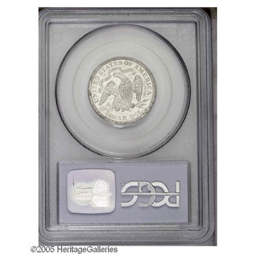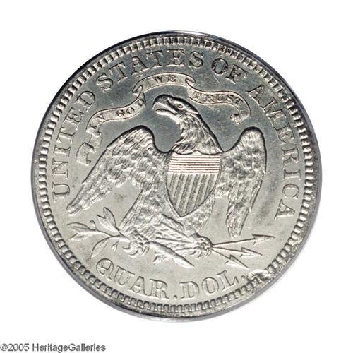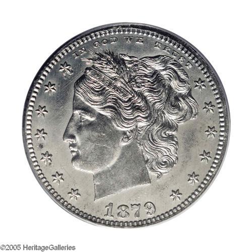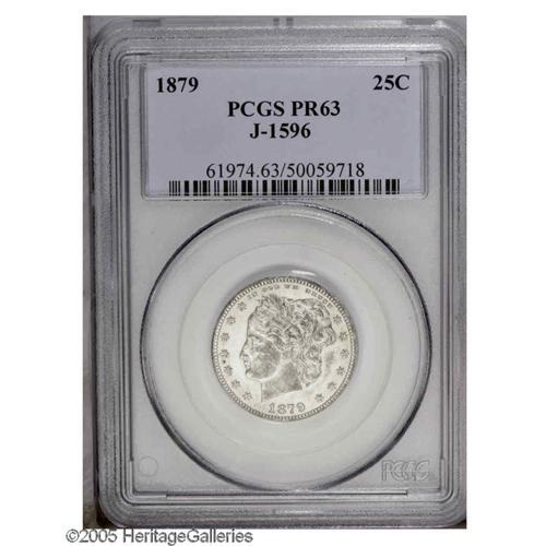 <B>1879<25C> Washlady Quarter Dollar, Judd-1596, Pollock-1786, R.8, PR63 PCGS.</B></I> Barber's popular "Washlady" design. The head of Liberty faces left with the motto IN GOD WE TRUST above and 1879 below. She is wearing a headband inscribed LIBERTY. The headband is ornamented with ears of wheat, cotton leaves, and bolls. There are 13 stars at the border arranged 7 left and 6 right. Normally paired with an upright eagle that is larger than the adopted design for the quarter, here is a unique specimen, struck in white metal, that is combined with the regular dies with motto reverse. The obverse is bright and noticeably striated while the more subdued reverse can be recognized by a planchet flaw on the border at 5 o'clock. According to the USPatterns.com website, this piece has traded privately several times over the past century, most famously being owned by Waldo Newcomer, and exhibited at the ANS by noted pattern expert William H. Woodin in 1914, and later owned by Major Lenox Lohr and offered for sale in 1960-61 for $475, but it has not been offered at public auction since the 19th century.<BR><I>Ex: Doughty Collection (New York Coin & Stamp 4/1891) lot 463; Woodside Collection (New York Coin & Stamp 4/1892) lot 368.</B></I>