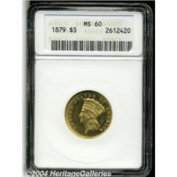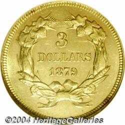 <B>1879<$3> MS60 ANACS.</B></I> This date has a low mintage of only 3,030 pieces, of which 3,000 are business strikes. The present example boasts fields that are nearly prooflike. Strongly impressed throughout, the surfaces reveal nice luster beneath apricot-gold toning. Just a few small, trivial marks are scattered about on this lovely Three Dollar gold piece, that just might be somewhat conservatively graded. A small planchet flaw (as produced) is noted in the field just beneath the Indian's headdress, as is a well-concealed alloy spot in the lower curl, which can be used to identify this specimen. <BR><BR><B>Important notice:</B> Heritage usually auctions material at the rate of 200-250 lots per hour. On some occasions eBay Live bid software or the Internet may not be able to keep up with the pace of the auction. We recommend placing a realistic absentee bid now as insurance to avoid disappointment. Occasionally the auctioneer may eliminate or reject an eBay Live bid, and the auctioneer may also reopen a lot after the close of the eBay live bidding (usually because we missed an audience bid), and may reject your bid even if it shows you as the winning bidder. By bidding via eBay Live, you agree that Heritage may award the lot to another bidder at its sole discretion under the circumstances described above or any other reasonable circumstances. Since eBay bids are not shown to us until we open the lot on the floor, we treat those bids just like floor bids. In most cases the floor responds before the eBay bid is presented to us, due to Internet lag time, so for consistency we have made it a policy that floor bids are always considered first over tie eBay live bids. Also please note that all Heritage lots purchased through eBay Live carry a 20% Buyer's Premium. Please make sure you read the Terms and Conditions before you bid. </span></font></tr></table></td></tr></table>