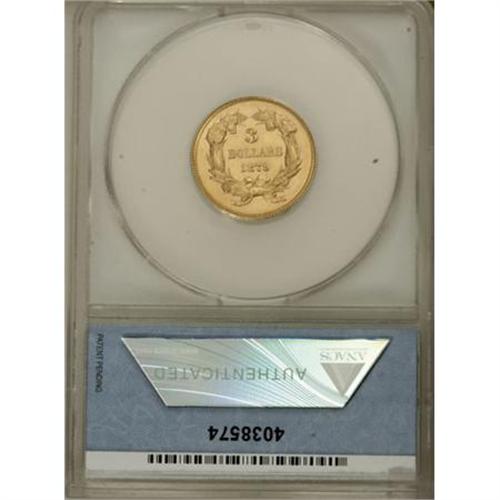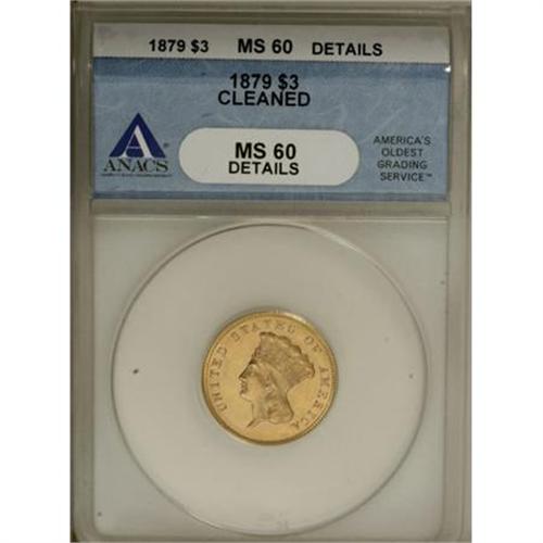 <B>1879 $3 --Cleaned--ANACS. MS60 Details.</B></I> An intricately struck example of this rare date. Slightly glossy from a wipe of a jeweler's cloth, and the left obverse field has faint scuffs. The mintage of 3,000 pieces is much lower than the preceding year's production.<BR><BR><B>Coin Engraver:</B> James B. Longacre<BR><BR><b>Shipping:</b> Coins & Currency (<a target="_blank" href="http://www.heritageauctions.com/common/shipping.php">view shipping information</a>)