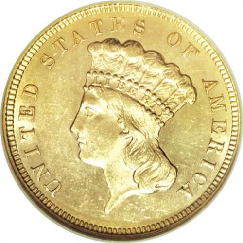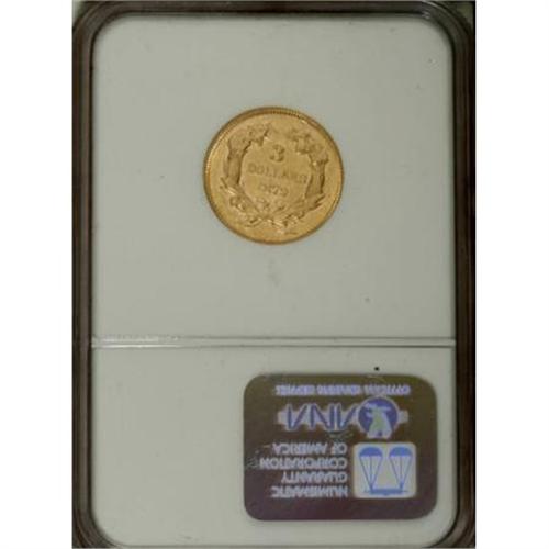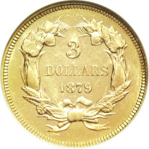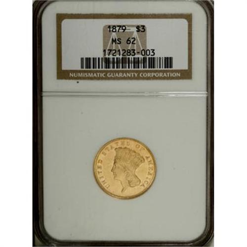 <B>1879 $3 MS62 NGC.</B></I> The surfaces are somewhat prooflike on this better-date example--although not so much as to merit NGC recognition--with light chatter showing in the mirrored fields and considerable mint frost on the devices. A couple of grade-consistent marks appear on each side, but there are no singular abrasions. Despite the small mintage of only 3,000 pieces, most examples show prooflikeness, and specimens of the issue are available, for a price, all the way up to MS67, the grade of a single PCGS-certified example.<BR><BR><B>Coin Engraver:</B> James B. Longacre<BR><BR><b>Shipping:</b> Coins & Currency (<a target="_blank" href="http://www.heritageauctions.com/common/shipping.php">view shipping information</a>)