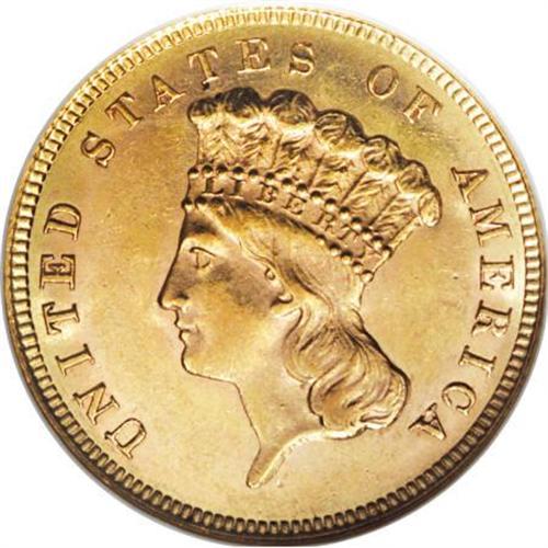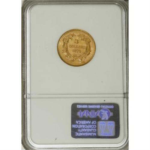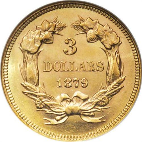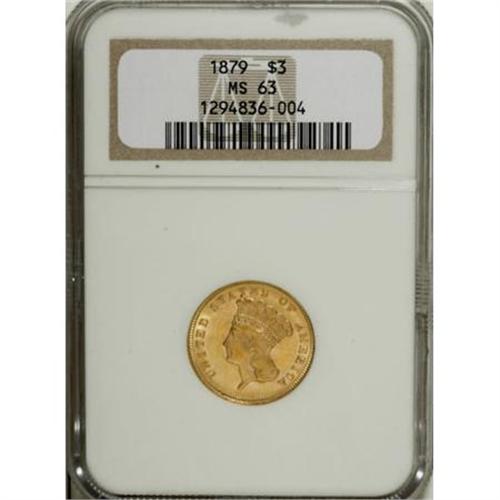 <B>1879 $3 MS63 NGC.</B></I> Radiantly lustrous surfaces display attractive peach-gold color imbued with hints of light green, mostly at the peripheries. An attentive strike brings about sharp definition on the design elements, and some trivial obverse marks define the grade. Both sides yield prooflike tendencies, which is typical for the issue.<BR><I>From The DAX Collection.</B></I><BR><BR><B>Coin Engraver:</B> James B. Longacre<BR><BR><b>Shipping:</b> Coins & Currency (<a target="_blank" href="http://www.heritageauctions.com/common/shipping.php">view shipping information</a>\)