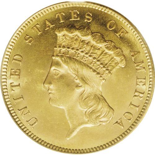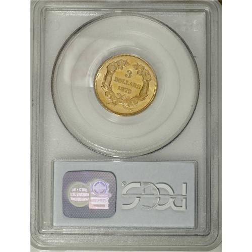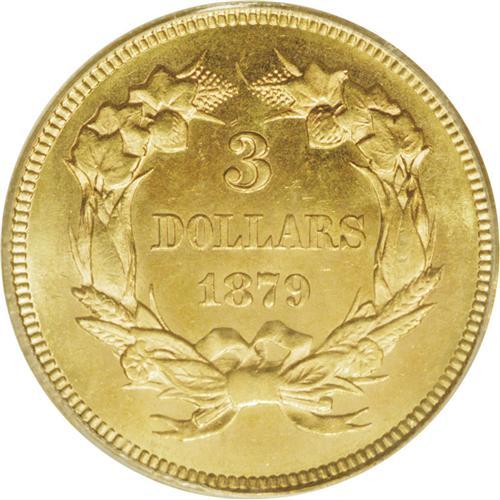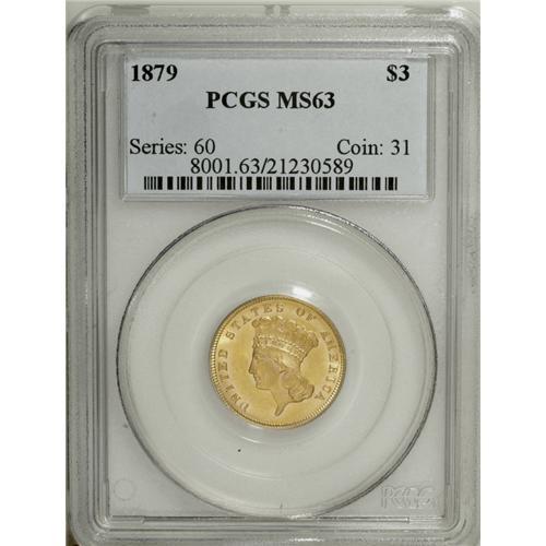 <B>1879 $3 MS63 PCGS.</B></I> After a respectable (by the standards of the series) mintage of 82,304 business strikes in 1878, Three Dollar gold production fell to 3,000 coins the following year. With bold striking definition and pleasing orange-gold color, this Choice quality example should have little trouble finding its way into a better date type set. Lightly abraded, both sides display partial reflectivity in the fields that is intermingled with mint frost.<BR><BR><b>Shipping:</b> Coin/Currency (<a target="_blank" href="http://www.heritageauctions.com/common/shipping.php">view shipping information</a>)