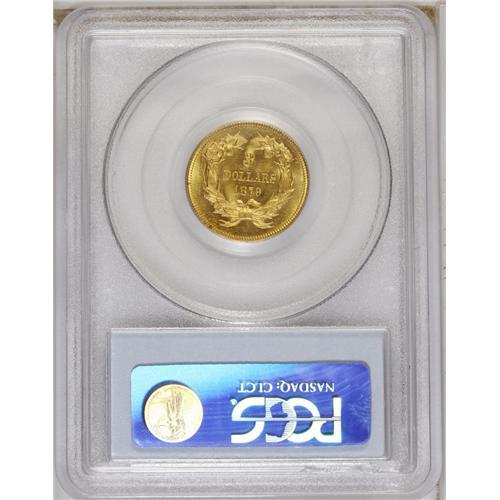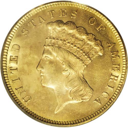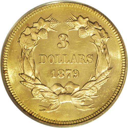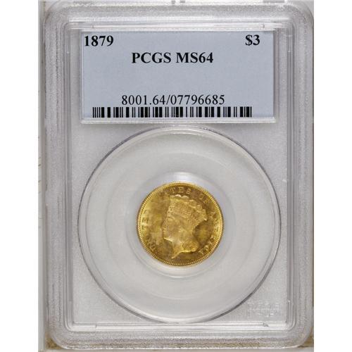 <B>1879 $3 MS64 PCGS.</B></I> The 1879 has a low mintage of only 3,000 pieces, but Henry Chapman believed 2,000 or more were melted in the mint. Hoards of this date were held by Ben Green and John Beck. Thomas Elder distributed numerous examples of this date over the years, apparently from the Green holdings. The Beck estate was sold in the 1970s and more 1879s entered the market. Today, several hundred Mint State examples exist of this date, but only a few dozen are known finer than this piece. The surfaces are bright and prooflike with rich orange-gold color and a hint of lilac on the face of Liberty. Well struck with no mentionable marks on either side.<BR><BR><b>Shipping:</b> Coin/Currency (<a target="_blank" href="http://www.heritageauctions.com/common/shipping.php">view shipping information</a>)