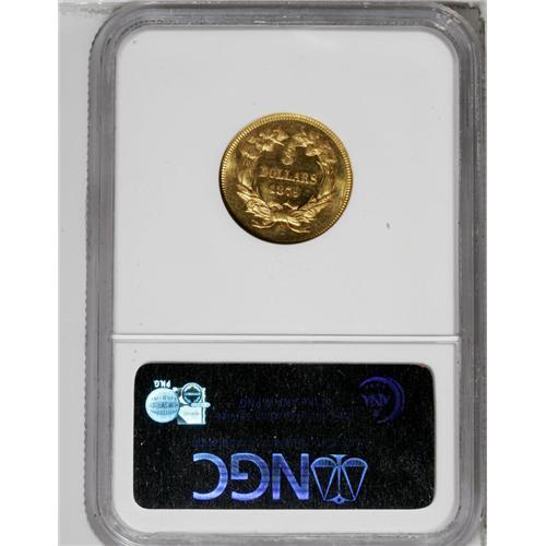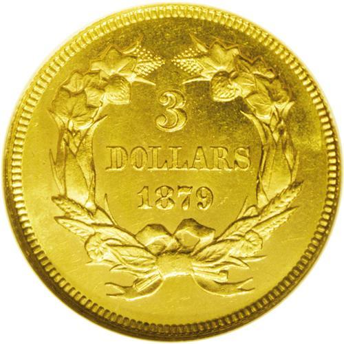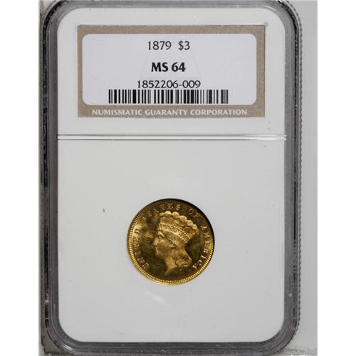 <B>1879<$3> MS64 PCGS.</B></I> The 1879 was produced to the extent of only 3,000 business strikes and 30 proofs. Few of the business strike coins reached circulation, however, and Mint State representatives of this issue are more easily obtainable than their circulated counterparts. Nevertheless, the 1879 is an immensely popular coin, and this coin's glowing appearance should further enhance its desirability. The fields are noticeably prooflike with a satiny finish intermixed, the devices are well frosted. Both sides are essentially yellow-gold in color with hints of pink in the recesses of the obverse. Virtually no grade-limiting abrasions are seen in the fields. In sum, this exceptionally smooth example is a marvel to behold.