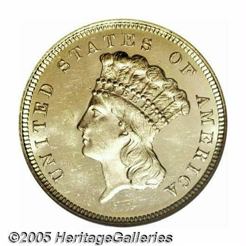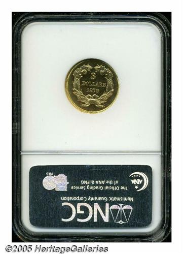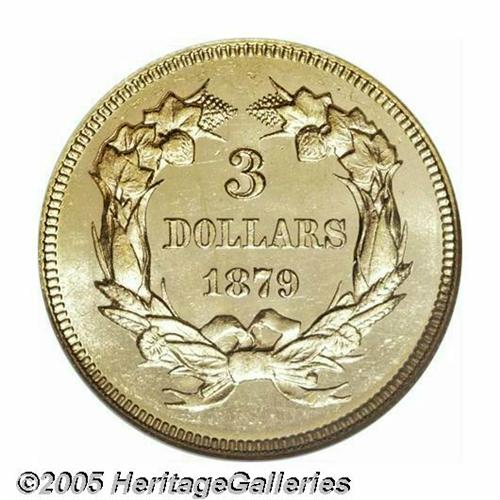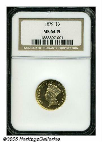 <B>1879<$3> MS64 Prooflike NGC.</B></I> With a mintage of just 3,000 business strikes, the 1879 issue begins a run of scarce low-mintage coins that continues to the end of the series a decade later. Even though these coins were extensively hoarded, higher grade coins such as this rarely appear on the market. This example is fully prooflike with bright yellow-gold luster. Frosty devices and mirrored fields created excellent eye appeal. Both sides have minor abrasions that are typical for the grade.