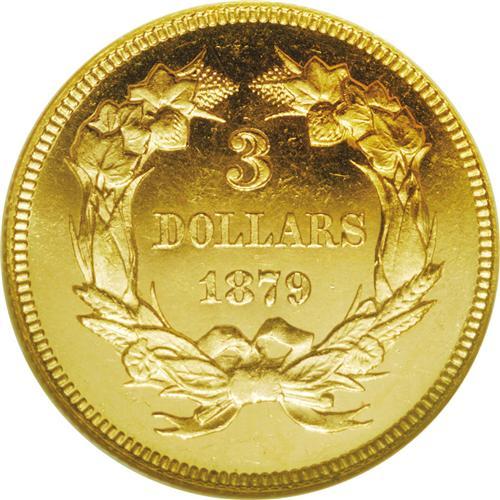 <B>1879<$3> MS65 <img border='0' src='http://www.heritagecoins.com/images/star.gif' width=10 height=10> Prooflike NGC.</B></I> The brilliant, luscious prooflike fields provide stark black-on-gold contrast to the frosty devices. Minted only a decade before the last gasp of the three dollar gold series, the 1879's mintage already signaled the beginning of the end, amounting to a trivial 3,000 examples in the second year of Morgan dollar mintage. This example's eye appeal is so high that NGC has awarded its coveted <img border='0' src='http://www.heritagecoins.com/images/star.gif' width=10 height=10> designation to this example. Only the most minuscule light abrasions and field chatter can be seen under a loupe, all of them mostly invisible unaided. Census: 1 in MS65<img border='0' src='http://www.heritagecoins.com/images/star.gif' width=10 height=10> Prooflike, none finer within either designation (4/06).