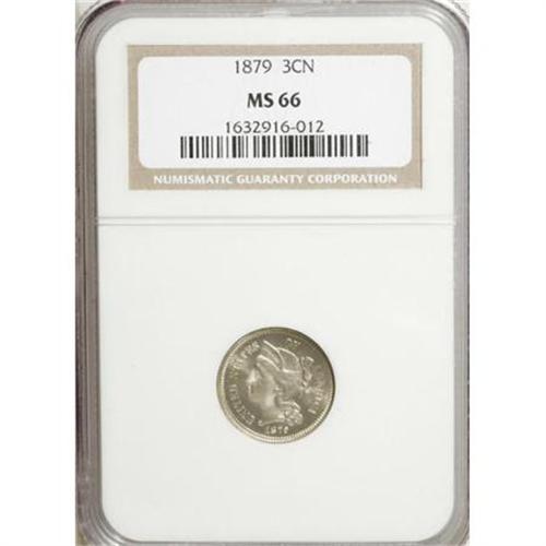 <B>1879 3CN MS66 NGC.</B></I> Both sides yield relatively strong field-motif contrast. Lightly toned surfaces are sharply struck, and have been well cared for. Census: 19 in 66, 4 finer (12/07).<BR><BR><B>Coin Engraver:</B> James B. Longacre<BR><BR><b>Shipping:</b> Coins & Currency (<a target="_blank" href="http://www.heritageauctions.com/common/shipping.php">view shipping information</a>)