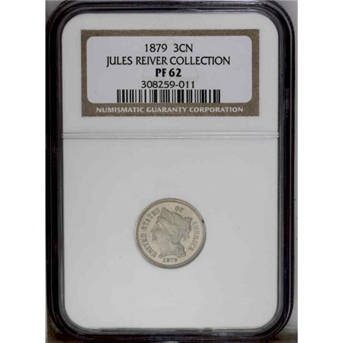 <B>1879<3CN> PR62 NGC.</B></I> Semi-reflective fields offer a mild contrast with the frosty devices that exhibit excellent definition throughout. A thin layer of light gray patina bathes unabraded surfaces. A small carbon spot is noted at 2 o'clock on the obverse rim. Envelope Included.